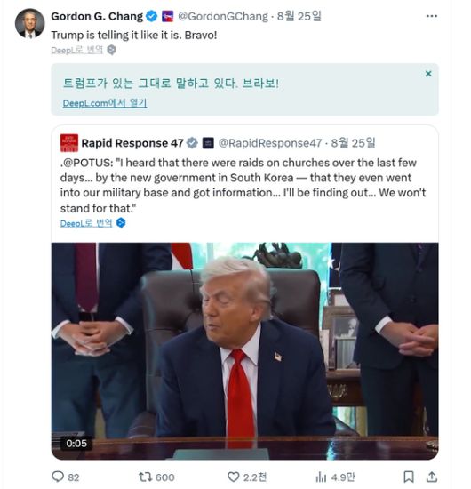 실제 고든 창 변호사는 트럼프 대통령이 25일 “한국 새 정부가 교회를 압수수색하고 우리 군사 기지까지 들어가 정보 수집을 했다고 한다. 내가 직접 알아보겠다”고 말하는 영상 클립을 곧장 자신의 소셜미디어 엑스(X)에 공유하며 “트럼프가 있는 그대로 말하고 있다. 브라보!”라고 환호하는 글을 올렸다. 이후 별도 글에서는 “트럼프 대통령이 오늘 이재명에게 상당한 압박을 가했다. 이제 우리 차례”라고도 했다.