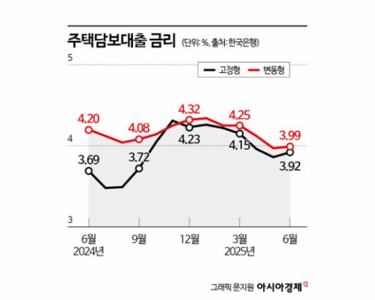 그 결과 전체 예금은행이 6월 신규 취급한 고정형 주담대 금리는 3.92%인 반면, 변동형 주담대 금리는 연 3.99%로 집계됐다. 금리인하기에 고정금리가 변동금리보다 더 저렴해진 것이다.