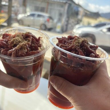 이 가운데 특히 주목받는 메뉴는 컵육회다. 생고기에 살얼음 육수, 오이, 배 등을 한 컵에 넣은 메뉴로 무더운 날씨에 시원하고 간편하게 즐길 수 있다는 점에서 큰 인기를 끌고 있다.