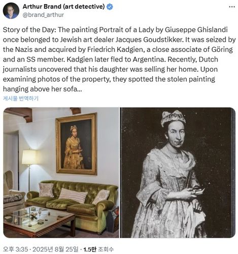 (서울=연합뉴스) 김아람 기자 = 80여년 전 나치가 네덜란드 암스테르담에서 약탈한 명화가 아르헨티나의 부동산 매물 광고에 등장해 귀추가 주목된다고 영국 일간 가디언이 26일(현지시간) 보도했다.