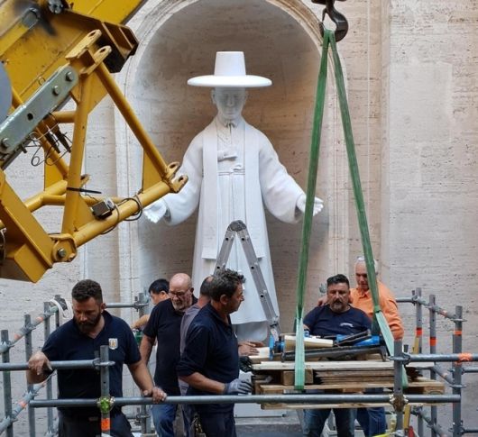 바티칸 성 베드로 대성전 외부 벽감에 성 김대건 안드레아 신부의 성상이 설치되는 모습. 한국천주교주교회의 제공 |