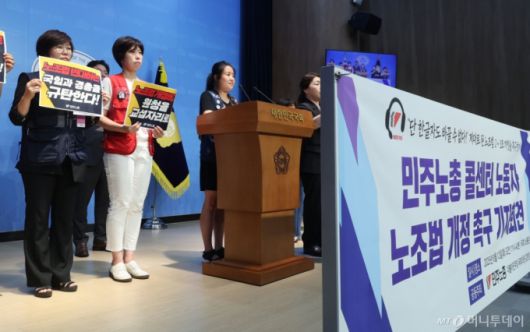 [서울=뉴시스] 조성봉 기자 = 김금영 민주노총 공공운수노조 국민건강보험고객센터지부 지부장이 12일 오전 서울 여의도 국회 소통관에서 열린 '민주노총 콜센터 노동자, 노조법 2조·3조 개정 촉구' 기자회견에서 발언을 하고 있다. 2025.08.12. suncho21@newsis.com /사진=조성봉 |
