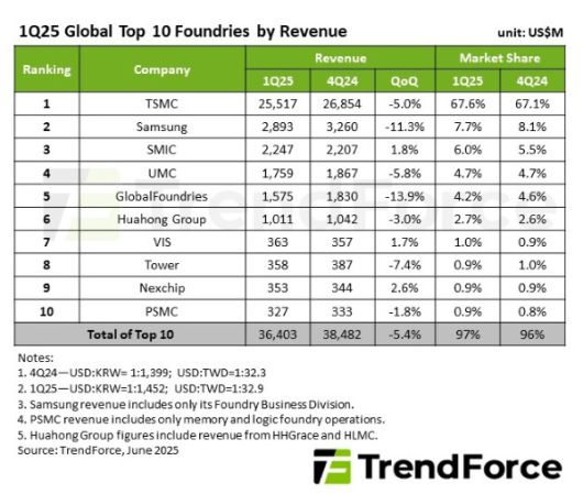 2025년 1분기 파운드리 업계 점유율/사진=트렌드포스 홈페이지 |