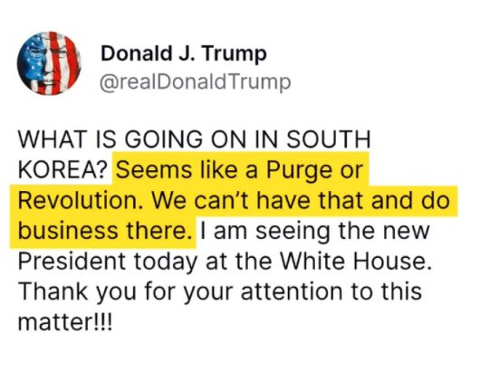◇ 김현정> 그러면 교수님, 두세 시간 전에 썼던 트럼프 SNS 숙청, 아니면 혁명 이거는 왜 나온 거죠? 분위기를 보면 막상 뚜껑 열어보고 분위기 보니까 이렇게 좋았는데 2~3시간 전에 저런 사실 상당히 무례한 저런 SNS를 왜 트럼프는 쓴 겁니까?