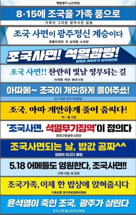 조 원장은 이날 페이스북을 통해 “광주 시내에 걸렸던 현수막 모음”이라는 글과 함께 현수막 이미지들을 모아 만든 사진을 게시했다. 현수막에는 ‘아따메~ 조국이 개안하게 풀어주쑈!’, ‘조국 사면, 석열무기징역이 정의다’, ‘조국 사면이 광주 정신 계승이다’ 등 조 원장의 사면을 요청하는 문구가 적혀 있다.