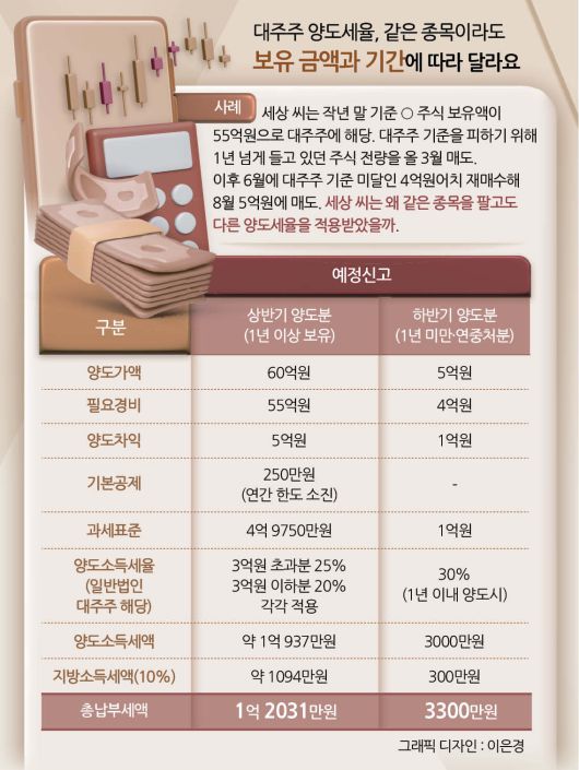 주식 자산가인 세상 씨는 코스피 시장에 상장된 ○ 주식 가치가 작년 말 55억원까지 불어나 대주주가 됐다. 대주주가 해당 주식을 팔면 소액주주와 달리 양도소득세가 부과된다. 이 때문에 세상 씨는 대주주 기준에서 벗어나기 위해 올 상반기 보유하던 ○ 주식을 60억원에 전부 정리했다.