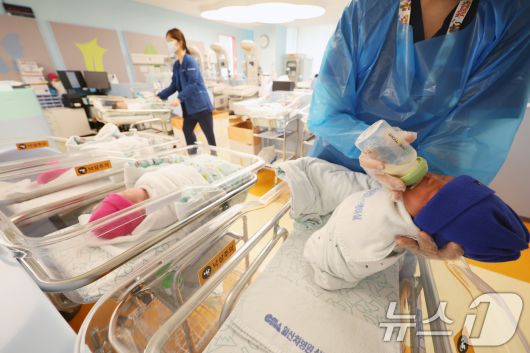 25일 경기 고양시 일산차병원 신생아실에서 간호사가 아기를 돌보고 있다. 2025.7.23/뉴스1 ⓒ News1 황기선 기자 |