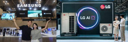 삼성전자 모델이 '기후산업국제박람회(WCE) 2025'가 열리는 부산 벡스코에 위치한 삼성전자 전시관을 소개하고 있다(왼쪽)·'AI 엔진'을 통해 실내외 온도 변화를 감지해 냉방 세기를 스스로 조절하고, 실내 환경이 쾌적해지면 절전 모도르 전환해 전기까지 아껴주는 LG전자 시스템에어컨 '멀티브이 아이(Multi V i)와 '멀티브이 에스(Multi V S)'. 삼성전자·LG전자 제공 |