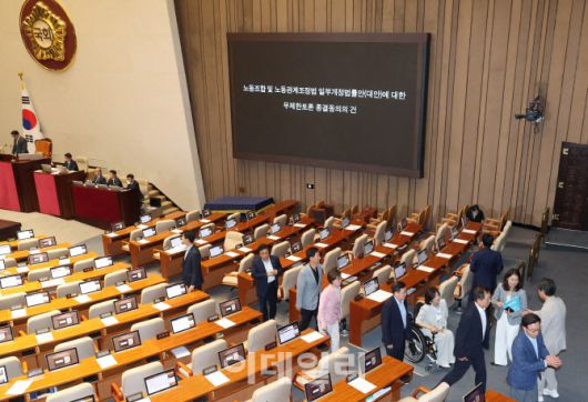지난 24일 오전 서울 여의도 국회 본회의에서 노동조합 및 노동관계조정법 일부개정법률안(대안)에 대한 무제한토론 종결동의의 건이 상정되자 국민의힘 의원들이 본회의장을 나가고 있다. (사진=노진환 기자) |