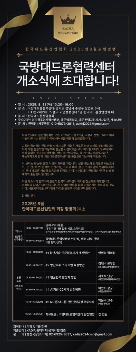 한편 오는 28일 현판식에 이어 관련 세미나가 열린다. 세미나에선 △첨단기술민군협력체계 개선방안(양병희 한국대드론산업협회장) △방산 우수스타트업 육성방안(김대수 경기창조혁신센터 본부장) △민군협력활성화방안(서호석 육군전력지원체계 사업단장) △AI(인공지능) 기반 C2체계 발전방향(이만희 육군방공학교장) △AI드론과 대드론 전문인력양성 우수사례(박윤수 재능대 교수) 등의 발표가 이어진다.