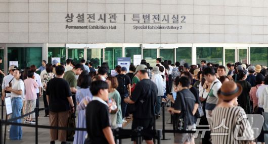 (서울=뉴스1) 황기선 기자 = 넷플릭스 애니메이션 영화 '케이팝 데몬 헌터스' 등 우리의 국가유산을 소재로 한 콘텐츠들이 전 세계적으로 인기를 얻고 있는 가운데 27일 오전 서울 용산구 국립중앙박물관 전시실 앞에서 관람객들이 줄을 서 입장을 기다리고 있다. 국립중앙박물관이 발표한 자료에 따르면, 올해 1월부터 이달 25일까지 누적 관람객은 418만 9822명으로 집계, 연간 관람객 수가 역대 최고를 기록했다고 밝혔다. 2025.8.27/뉴스1