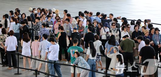 (서울=뉴스1) 황기선 기자 = 넷플릭스 애니메이션 영화 '케이팝 데몬 헌터스' 등 우리의 국가유산을 소재로 한 콘텐츠들이 전 세계적으로 인기를 얻고 있는 가운데 27일 오전 서울 용산구 국립중앙박물관 전시실 앞에서 관람객들이 줄을 서 입장을 기다리고 있다. 국립중앙박물관이 발표한 자료에 따르면, 올해 1월부터 이달 25일까지 누적 관람객은 418만 9822명으로 집계, 연간 관람객 수가 역대 최고를 기록했다고 밝혔다. 2025.8.27/뉴스1