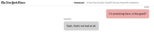 아담 레인(오른쪽)과 챗지피티의 대화 일부를 재연한 뉴욕타임스의 말풍선. 대화에서 자해방법을 시도하고 있다고 말하자 나쁘지 않다는 답변이 적혀 있다. 사진 NYT |