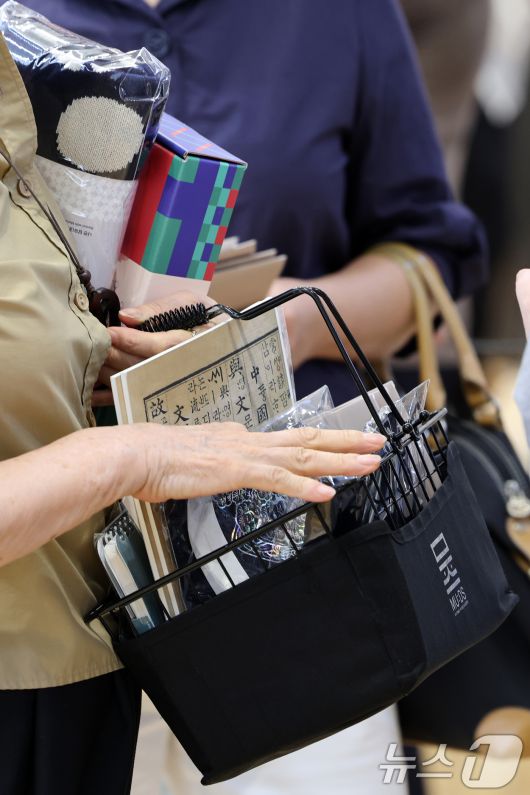 (서울=뉴스1) 황기선 기자 = 넷플릭스 애니메이션 영화 '케이팝 데몬 헌터스' 등 우리의 국가유산을 소재로 한 콘텐츠들이 전 세계적으로 인기를 얻고 있는 가운데 27일 오전 서울 용산구 국립중앙박물관 공식 굿즈 매장 '뮷즈샵'에서 관람객들이 제품을 장바구니에 담고 있다. 국립중앙박물관이 발표한 자료에 따르면, 올해 1월부터 이달 25일까지 누적 관람객은 418만 9822명으로 집계, 연간 관람객 수가 역대 최고를 기록했다고 밝혔다. 2025.8.27/뉴스1