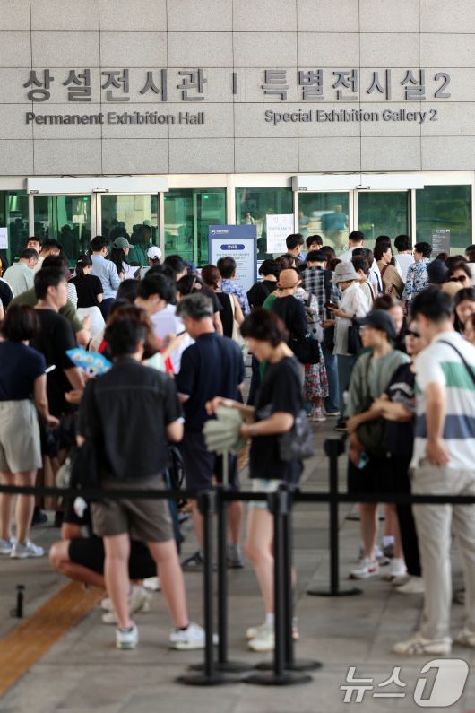 (서울=뉴스1) 황기선 기자 = 넷플릭스 애니메이션 영화 '케이팝 데몬 헌터스' 등 우리의 국가유산을 소재로 한 콘텐츠들이 전 세계적으로 인기를 얻고 있는 가운데 27일 오전 서울 용산구 국립중앙박물관 전시실 앞에서 관람객들이 줄을 서 입장을 기다리고 있다. 국립중앙박물관이 발표한 자료에 따르면, 올해 1월부터 이달 25일까지 누적 관람객은 418만 9822명으로 집계, 연간 관람객 수가 역대 최고를 기록했다고 밝혔다. 2025.8.27/뉴스1