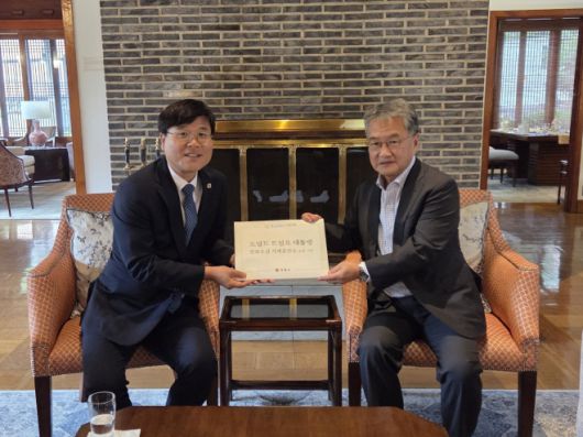 변광용 경남 거제시장이 27일 주한미국대사관에서 조셉 윤 주한미국대사대리를 만나 트럼프 미국 대통령의 한화오션 거제사업장 초청 서한을 전달했다.