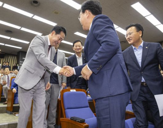 장동혁 국민의힘 신임 대표가 27일 국회에서 열린 의원총회에 입장하며 동료 의원들과 인사하고 있다. /연합 |