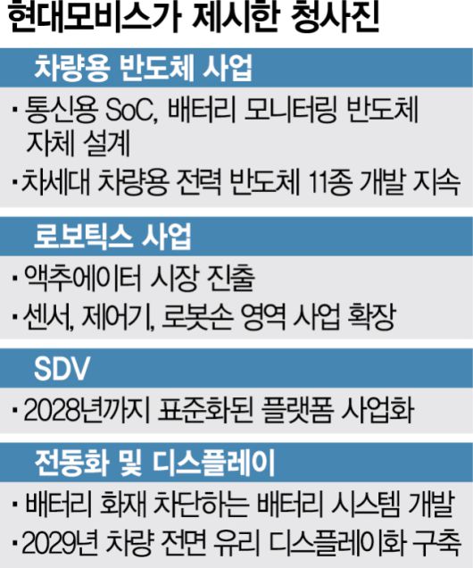 현대모비스(012330)가 차량용 반도체와 로보틱스 사업 분야에 본격 진출한다. 모빌리티 시장의 새로운 패러다임을 주도하기 위해 이들 신성장 동력에 대한 독자적 역량을 확보하겠다는 것이다.