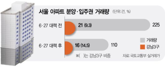 6·27 대책 이후 서울 아파트의 분양·입주권 거래량이 반 토막 난 것으로 나타났다. 주택담보대출 상한을 6억 원으로 제한하는 6·27 대책이 분양권과 입주권 매매 시에도 적용되다 보니 대출을 받기 어려워진 수요자들이 이탈했기 때문으로 풀이된다.