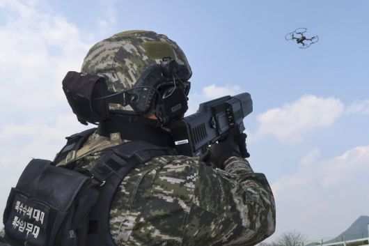 해병대 특수수색대대가 지난 4월 10일 경북 의성군 드론비행시험센터에서 휴대용 소형 드론대응체계(안티드론건) 실사격 훈련을 실시했다. 이번 훈련은 대테러 경호와 경비작전 등에 있어 드론 테러 위협에 신속히 대응하기 위한 훈련이댜. 해병대1사단제공 |