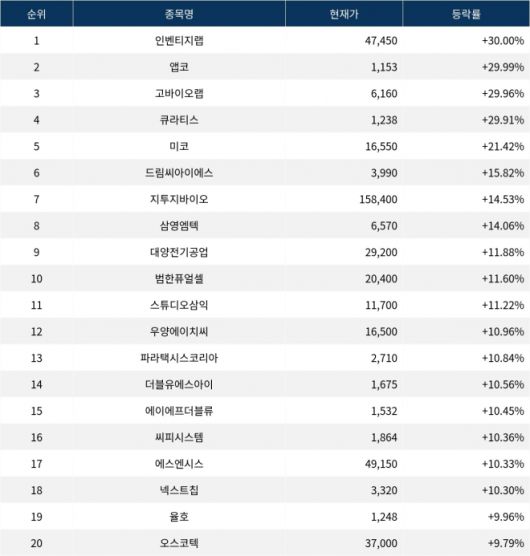 이어 상승률 2위 앱코(129890)는 주가가 29.99% 상한가를 기록하며 종가 1,153원에 상승 마감했다. 상승률 3위 고바이오랩(348150)의 주가는 6,160원으로 29.96% 폭등하며 마감했다. 상승률 4위 큐라티스(348080)는 29.91% 상승하며 1,238원에 마감했다. 상승률 5위 미코(059090)는 21.42%의 강세를 보이며 종가 16,550원에 마감했다.