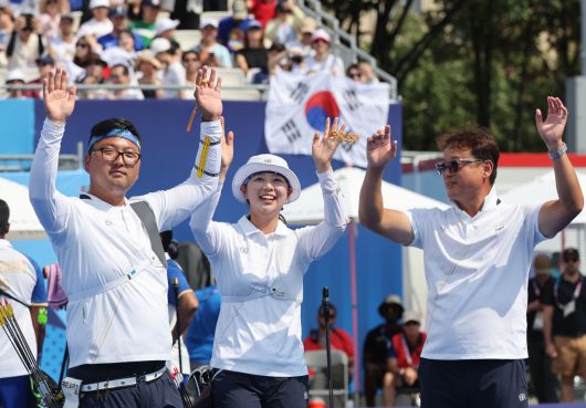 지난해 8월 2일(현지시간) 프랑스 파리 레쟁발리드에서 열린 2024 파리 올림픽 양궁 혼성 단체전 인도와의 준결승에서 승리한 한국 김우진(왼쪽부터), 임시현과 박성수 감독이 기뻐하고 있다. [연합] |
