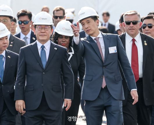 이재명 대통령이 26일(현지 시간) 필라델피아 한화 필리조선소를 방문해 김동관 한화그룹 부회장과 함께 현장 시찰을 하고 있다. 김창길 기자 |