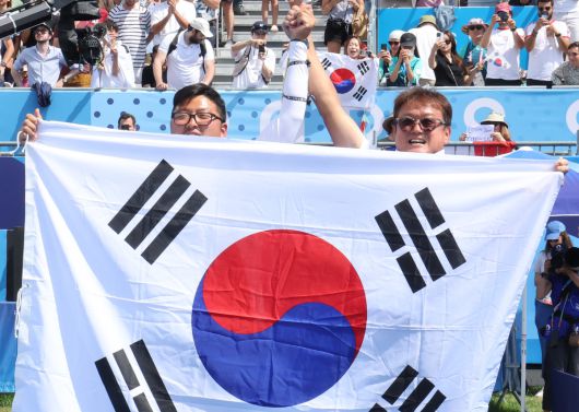 지난해 8월 4일(현지시간) 프랑스 파리 레쟁발리드에서 열린 2024 파리올림픽 양궁 남자 개인전 미국의 브레이디 엘리슨과의 결승에서 승리한 한국 김우진이 박성수(오른쪽) 감독과 태극기를 들고 관중에게 인사하고 있다. (연합뉴스) |