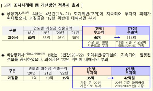이에, 금융 당국은 회계부정 책임에 비례해 합당한 수준의 과징금이 부과될 수 있도록 과징금 부과한도와 적용기준을 개선하기로 했다.