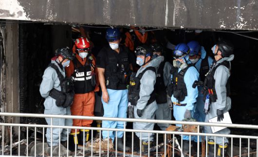 지난 18일 서울 마포구 창전동 아파트 화재 현장에서 소방, 경찰 등 유관기관 관계자들이 정확한 화재 원인을 밝히기 위해 합동감식을 하고 있다. 지난 17일 이 아파트에서 화재가 발생해 어머니와 아들 등 2명이 사망하고 13명이 부상했다. 뉴스1 |
