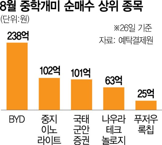중학개미들을 다시 끌어온 배경은 중국 증시가 고공 행진을 이어간 영향이 크다. 인베스팅닷컴에 따르면 상해종합 지수는 이달 들어 7.12% 급등했다. 미국 연방준비제도(Fed·연준)의 기준금리 인하 기대감에 오는 10월 공개 예정인 중국 정부의 첨단산업 육성 정책 기대가 맞물려 투심을 자극했다. 특히 중국 내 혁신 기업 중에서도 상위 50곳을 추린 중국 과창판50 지수는 이달 들어서만 21.28% 폭등했다.