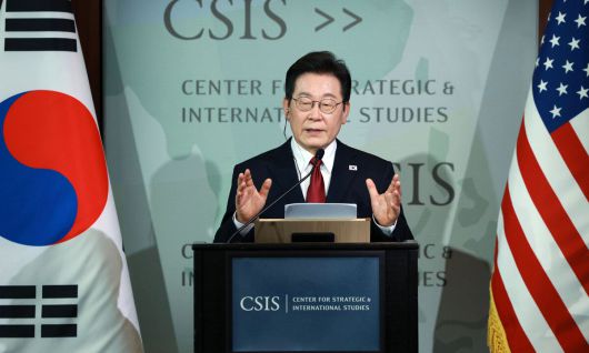 이재명 대통령이 25일(현지시간) 미국 워싱턴DC 국제전략문제연구소(CSIS)에서 정책 연설을 하고 있다. 연합뉴스 |