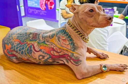 27일(현지시간) 홍콩 사우스차이나모닝포스트(SCMP)에 따르면 지난 22일 상하이에서 열린 펫 박람회에서 털이 없이 없는 멕시코 출신 견종의 반려견의 몸에 화려한 용 문신이 새겨져 있는 모습이 포착됐다. 해당 반려견은 금 목걸이와 손목시계까지 착용해 마치 조직폭력배를 연상케 하는 모습이었다.