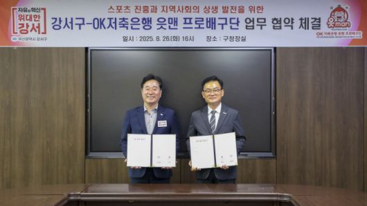 [부산=스포츠조선 김영록 기자] OK저축은행 읏맨 프로배구단(이하 OK 읏맨 배구단, 구단주 최윤)은 27일 부산시 강서구와 원활한 홈 경기 운영및 지역 활성화를 위한 업무협약(MOU)을 체결했다고 밝혔다.