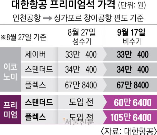 더욱이 프리미엄석 도입으로 고객들이 가장 많이 이용하는 이코노미석의 공간은 1인치씩 줄어들었지만 정작 이코노미석 가격은 그대로 유지됐다. 특히 다음달부터 비수기에 접어들면서 항공운임이 내려가는데도 인천~싱가포르행 노선의 이코노미석 가격을 8월 성수기와 동일하게 책정한 것은 소비자 입장에서 보면 가격을 인상한 셈이다.