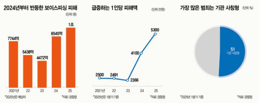 사실 그동안 보이스피싱은 ‘한물간 범죄’ 취급을 받았다. 사건 건수와 피해 규모가 계속해서 감소한 탓이다. 보이스피싱 피해 규모는 2021년 7744억원에서 2022년과 2023년 각각 5438억원, 4472억원으로 2년 연속 줄었다. 하지만 지난해부터 상황이 반전됐다. 해외 범죄 조직의 기승, AI 기술 발전으로 인한 딥페이크 음성의 등장으로 보이스피싱 범죄가 급격히 늘어났다. 2024년 보이스피싱 연간 피해 금액은 8545억원으로 역대 최대치를 기록했다. 피해 건수도 2만건을 넘었다. 올해 상황은 더 심각하다. 상반기에만 6000억원이 넘는 피해가 발생했다. 연간 피해 규모는 사상 처음으로 1조원을 웃돌 것으로 보인다.