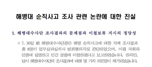 '순직 해병 수사 외압' 의혹과 관련해 국방부가 2023년 9월 작성한 ‘해병대 순직 사고 조사 관련 논란에 대한 진실’ 문건. /독자 제공