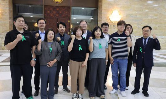 오송 참사 유가족∙생존자협의회, 시민대책위, 국회의원 등이 27일 국회에서 오송 참사를 추모하는 초록 리본을 목에 걸고 국정조사 국회 의결에 환영의 뜻을 전하고 진상규명을 촉구했다. 송재봉 더불어민주당의원실 제공 |