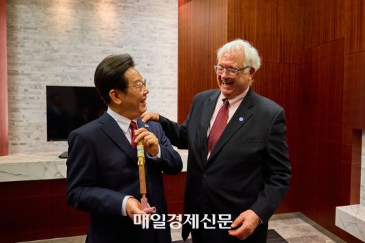 이재명 대통령이 25일(현지시간) 미국 워싱턴DC 국제전략문제연구소(CSIS)에서 열린 정책 연설에서 존 햄리 CSIS 소장으로부터 전통 파이프 담배를 선물 받고 있다. [워싱턴DC/김호영기자] |