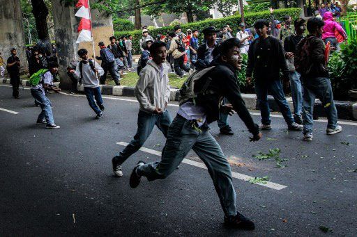 자카르타의 한 거리에서 시위대가 의회 해산을 요구하는 시위 도중 경찰과 대치하고 있다. (사진=AFP) |