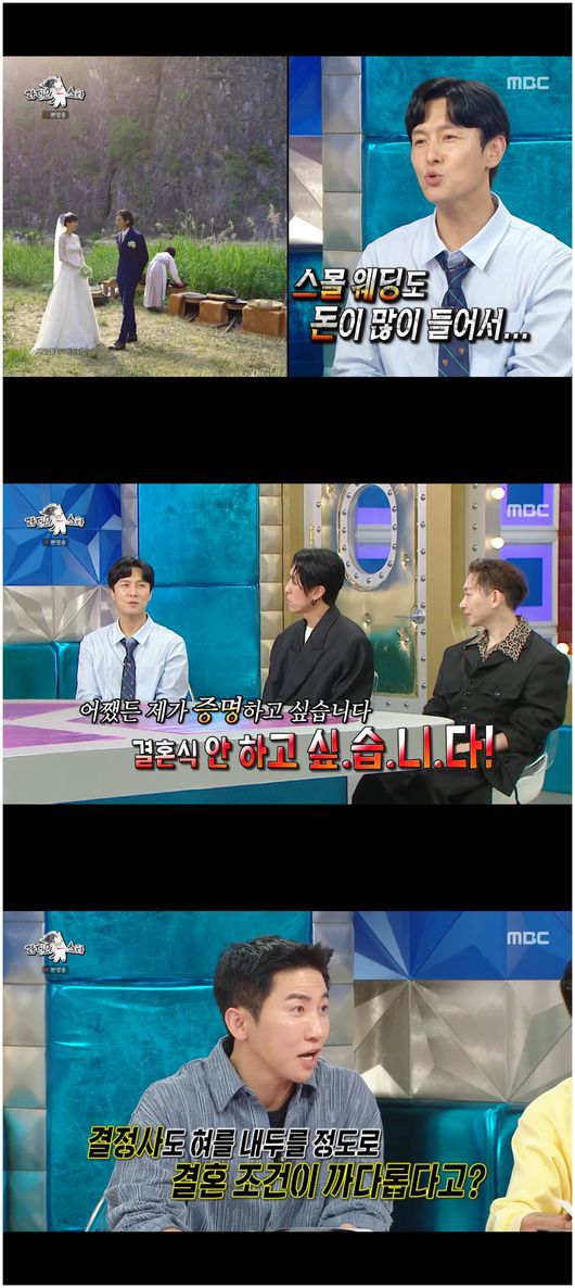 장도연은 “모든 조건이 다 맞는데, 결혼식만 한다고 하면?”라며 재차 물었고, 김동완은 “결혼식 안 하고 싶다"라며 단호하게 말했다./osen_jin0310@osen.co.kr