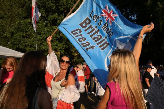 지난 8일 영국 에섹스주 에핑에서 열린 반이민 시위에서 한 참가자가 '영국을 위대하게 만들자'는 문구가 적힌 개혁당 깃발을 흔들고 있다./로이터 연합뉴스 |