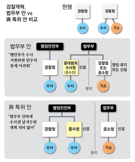 민주당 검찰특위에 앞서 검찰개혁 4법(검찰청 폐지·공소청 신설·중대범죄수사청 신설·국가수사위원회 설치)을 발의한 민주당 국회 공정사회포럼(처럼회)은 중수청을 행안부 산하에 두도록 했다. TF 단장 출신인 김용민 의원은 25일 “검찰이 얼마나 나쁜 짓을 했는지 인식하고 개혁을 한다면 적어도 같은 조직에 수사·기소권을 두지 않는 것이 핵심”이라며 “법무부에 두면 수사와 기소가 실질적으로 분리됐다고 평가할 수 없다”고 말했다. 서보학 경희대 법학전문대학원 교수는 “중수청을 법무부에 두면 한 집 안에서 너(중수청)는 안방 쓰고 나(공소청)는 건넛방 쓰는 격”이라며 “그렇게 되면 수사·기소 분리가 아무런 의미가 없어진다”고 했다.