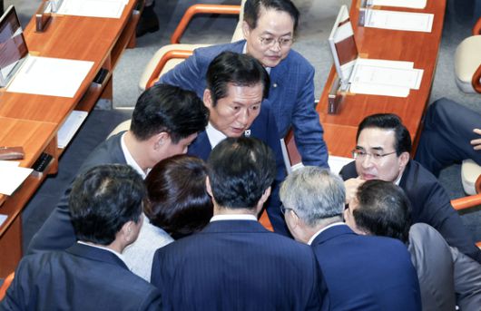 정청래 더불어민주당 대표가 27일 오후 국회 본회의장에서 민형배 검찰개혁 특별위원회 위원장 등 의원들과 대화하고 있다. 김성룡 기자 |