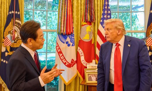 이재명 대통령이 25일(현지시각) 미국 워싱턴DC 백악관 오벌오피스에서 열린 한미 정상회담뒤 도널드 트럼프 미국 대통령과 대화하고 있다. 공동취재사진 |