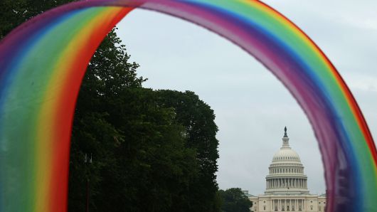 ▲ 지난 6월 워싱턴 DC에서 열린 '월드프라이드 2025'에서 무지개 깃발이 휘날리고 있다.