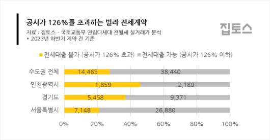 지역별로 전세 대출금이 공시가격의 126%를 초과해 체결된 전세 계약은 인천광역시가 45.9%로 가장 높았으며, 이어 경기도가 36.8%, 서울이 21.0% 순이었다. 인천과 경기 지역 빌라 10곳 중 4곳 가까이가 보증금 감액 없이는 동일 조건의 전세 계약에서 대출이 어려워, 역전세 및 보증금 반환 분쟁의 ‘뇌관’이 될 수 있다는 우려가 나온다.