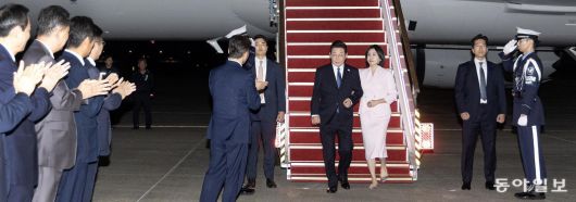 1호기 문이 열리자, 이 대통령은 연분홍색 투피스를 입은 김혜경 여사와 함께 팔짱을 끼고 내려와 환영 인사들과 일일이 악수했다. 도열한 인사들은 일제히 박수로 대통령 내외를 맞았다.