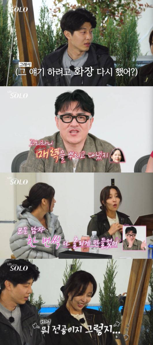 그러자 영수는 "그 얘기 하려고 화장 다시 했어? 더 예뻐 보이는 얼굴로 죽이려고? 내가 싫은 소리 할 거니까 미련 남게 더 예쁜 얼굴로 화장 다시 한 거야?"라며 장난을 쳤다. 그러면서 "저기서(여자방)에서 무슨 조언을 해줬냐"고 물었다.