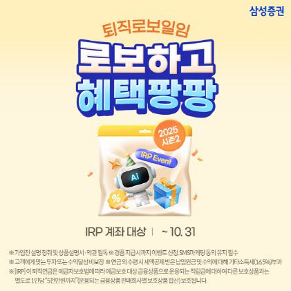 삼성증권 퇴직연금 IRP계좌에서 가입한 로보일임 서비스 순입금 금액에 따라 상품권을 증정한다. 100만원 이상 300만원 미만 순입금한 고객은 모바일 상품권 5000원권, 300만원 이상 순입금 한 고객은 1만원권을 지급한다. 경품은 IRP 로보일임 잔고를 11월 말까지 유지한 고객들에게 11월 말에 일괄 제공될 예정이다.